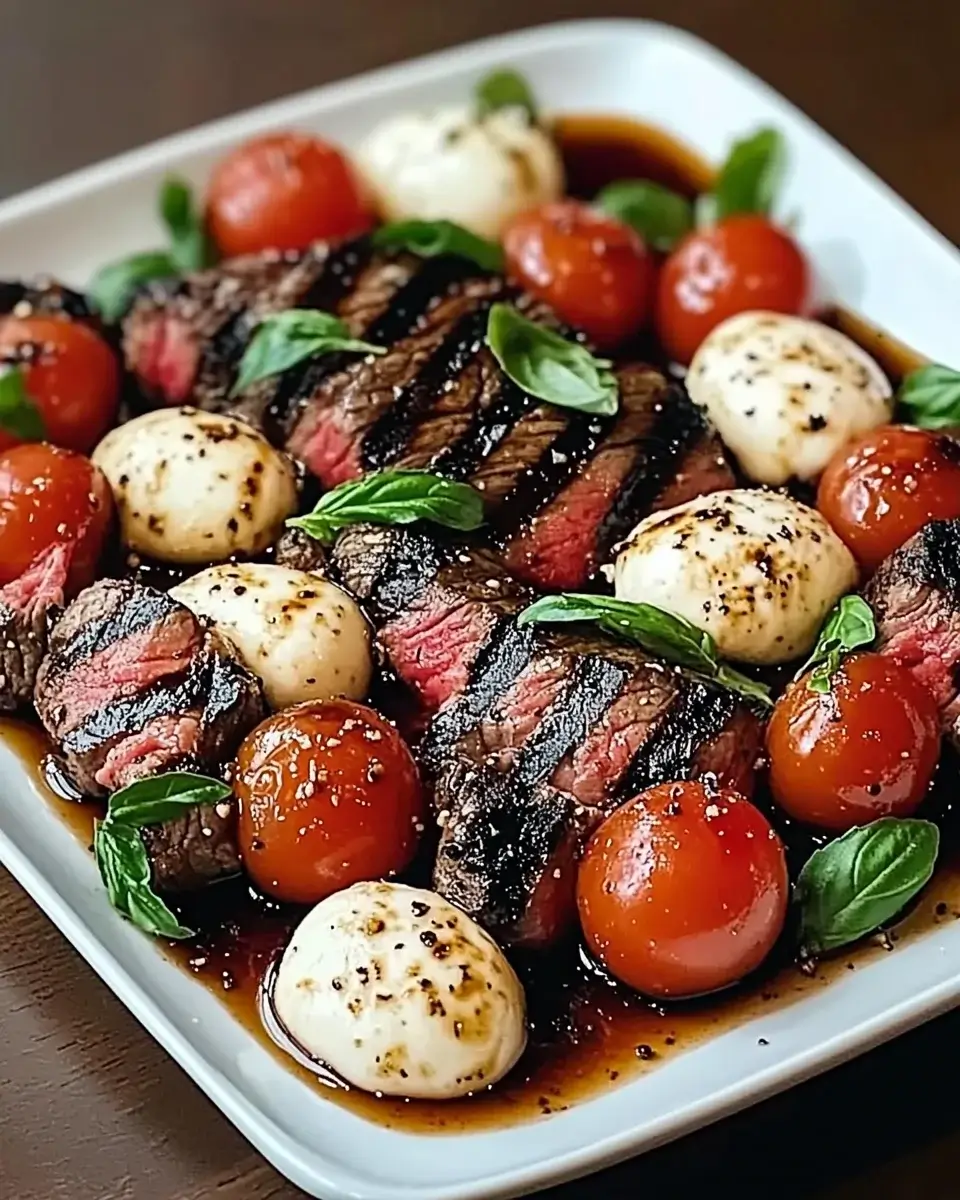 While the steak is resting, combine the cherry tomatoes, mozzarella, and basil in a bowl. Drizzle with the reserved marinade and toss gently to combine.