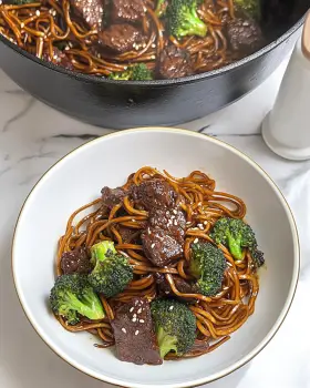 Combine Everything: Add the cooked beef and noodles back to the pan. Pour in the sauce and toss to coat everything evenly.