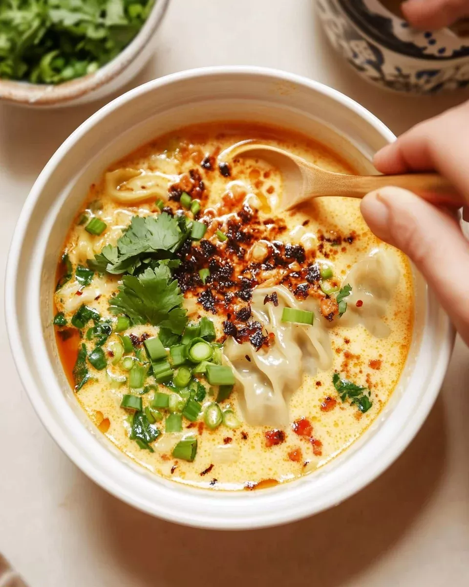 - Ladle the soup into bowls, ensuring each portion includes a few potstickers. Top with wilted spinach, a drizzle of Sichuan Chili Crisp, chopped green onions, and sesame seeds. Serve immediately and enjoy!