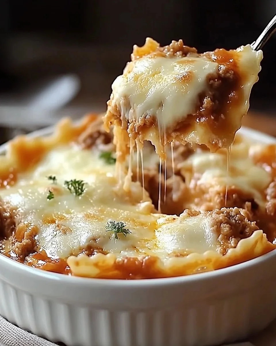 - Layer meat sauce, frozen ravioli, cheese mixture, and mozzarella in a baking dish.
