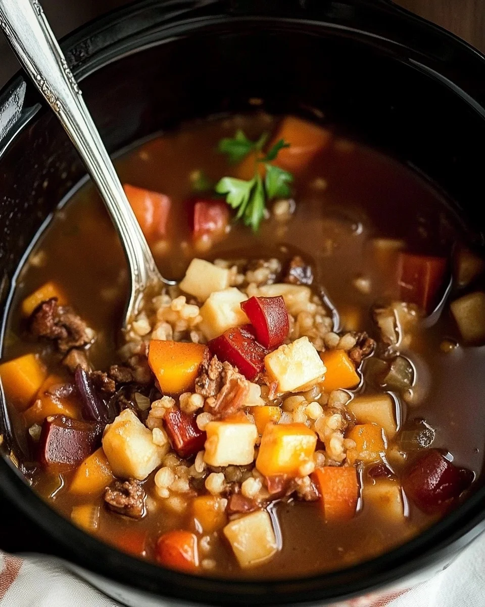 - Add the carrots, onion, potatoes, celery, garlic, ginger, beef broth, red wine (if using), tomato paste, tomato sauce, Dijon mustard, Italian seasoning, salt, pepper, bay leaf, and pearl barley into the slow cooker. Mix until everything is well combined.