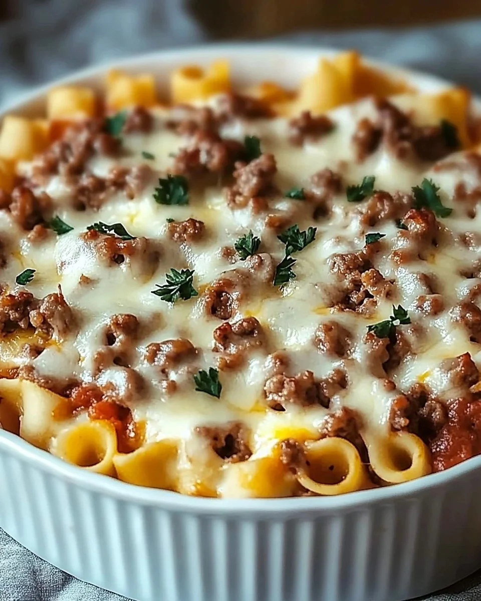 - Preheat your oven to 375°F (190°C). Grease a 9x13-inch baking dish. Spread half of the cooked noodles evenly in the dish. Layer half of the beef mixture, followed by half of the creamy mixture. Repeat the layers, finishing with the remaining beef mixture on top. Sprinkle shredded cheddar cheese evenly over the casserole.