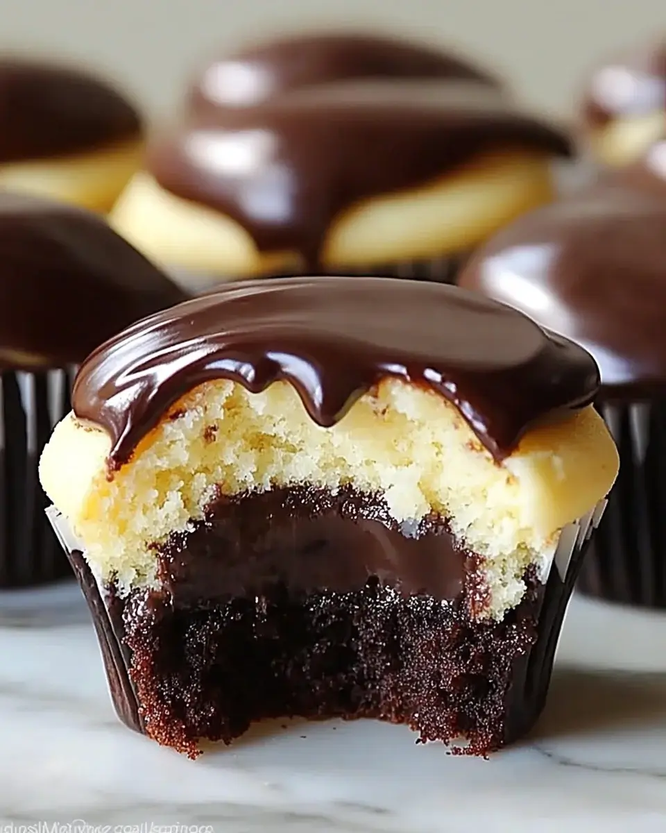 Top each filled cupcake with a generous drizzle of chocolate ganache.