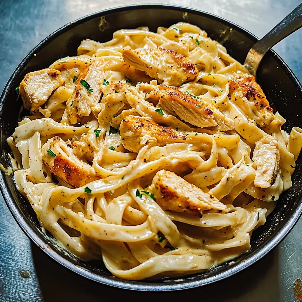 While the chicken is resting, cook the fettuccine pasta according to package instructions until al dente. Drain and set aside.