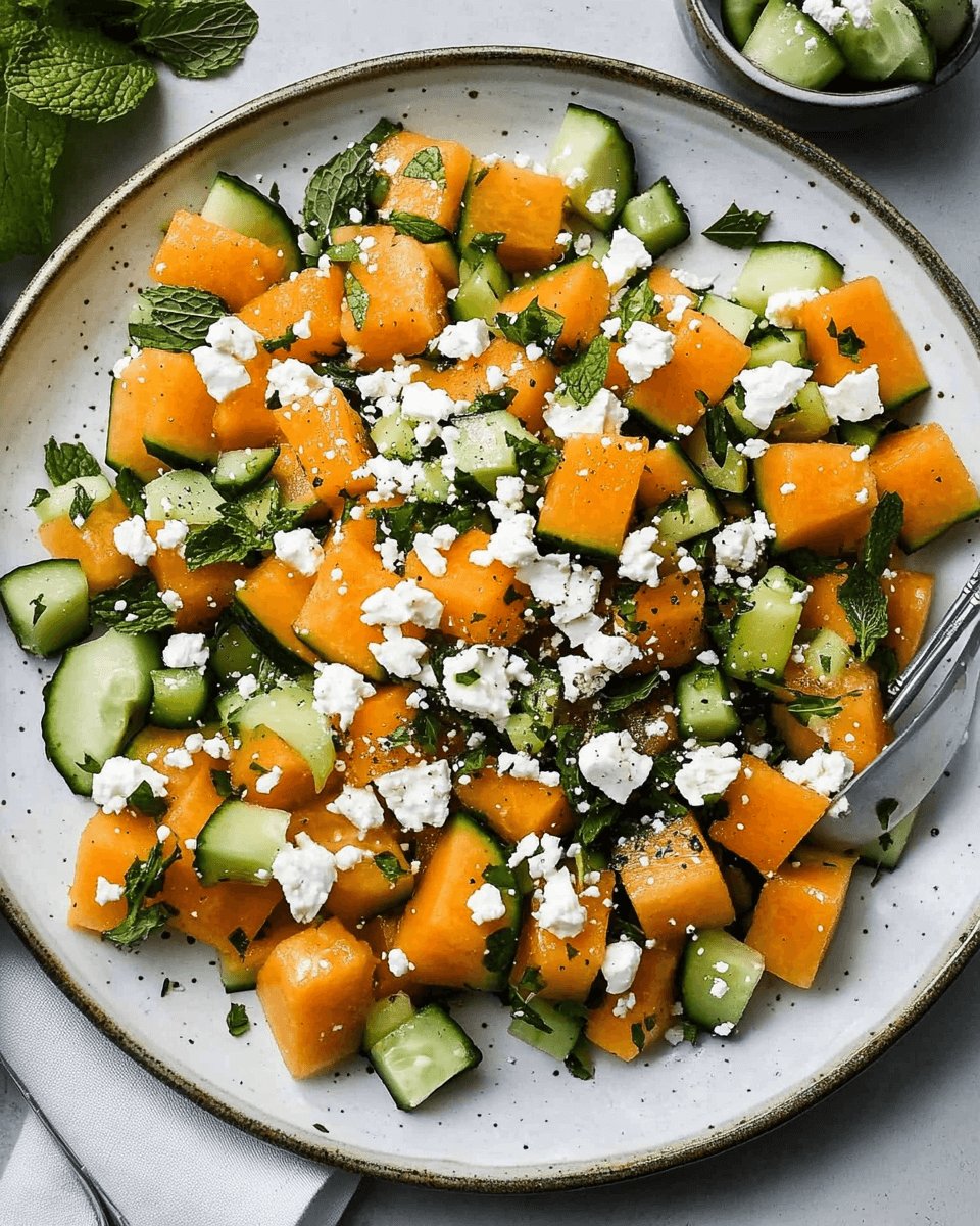 In a large mixing bowl, combine the cubed cantaloupe, honeydew melon, and diced cucumber.