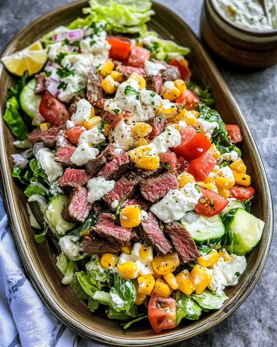 While the steak is resting, prepare the salad. In a large bowl, combine the chopped romaine, cherry tomatoes, cucumber, bell pepper, red onion, and avocado.