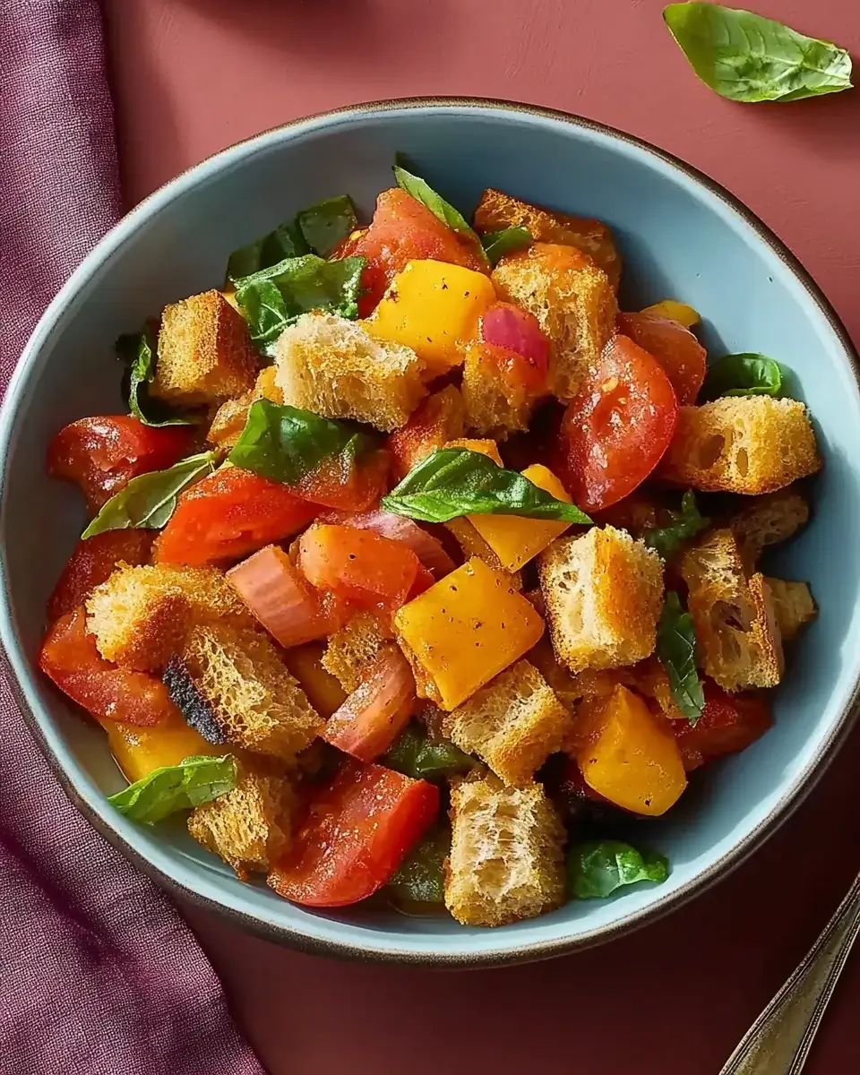 Add the toasted bread cubes to the vegetable mixture. Pour the dressing over the salad and toss gently to combine. Let the salad sit for about 15-20 minutes to allow the bread to soak up the flavors.