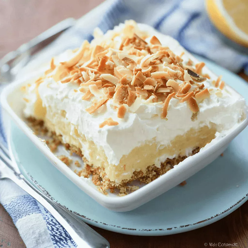 Before serving, you can garnish with additional whipped topping and toasted coconut if desired. Cut into squares and enjoy!