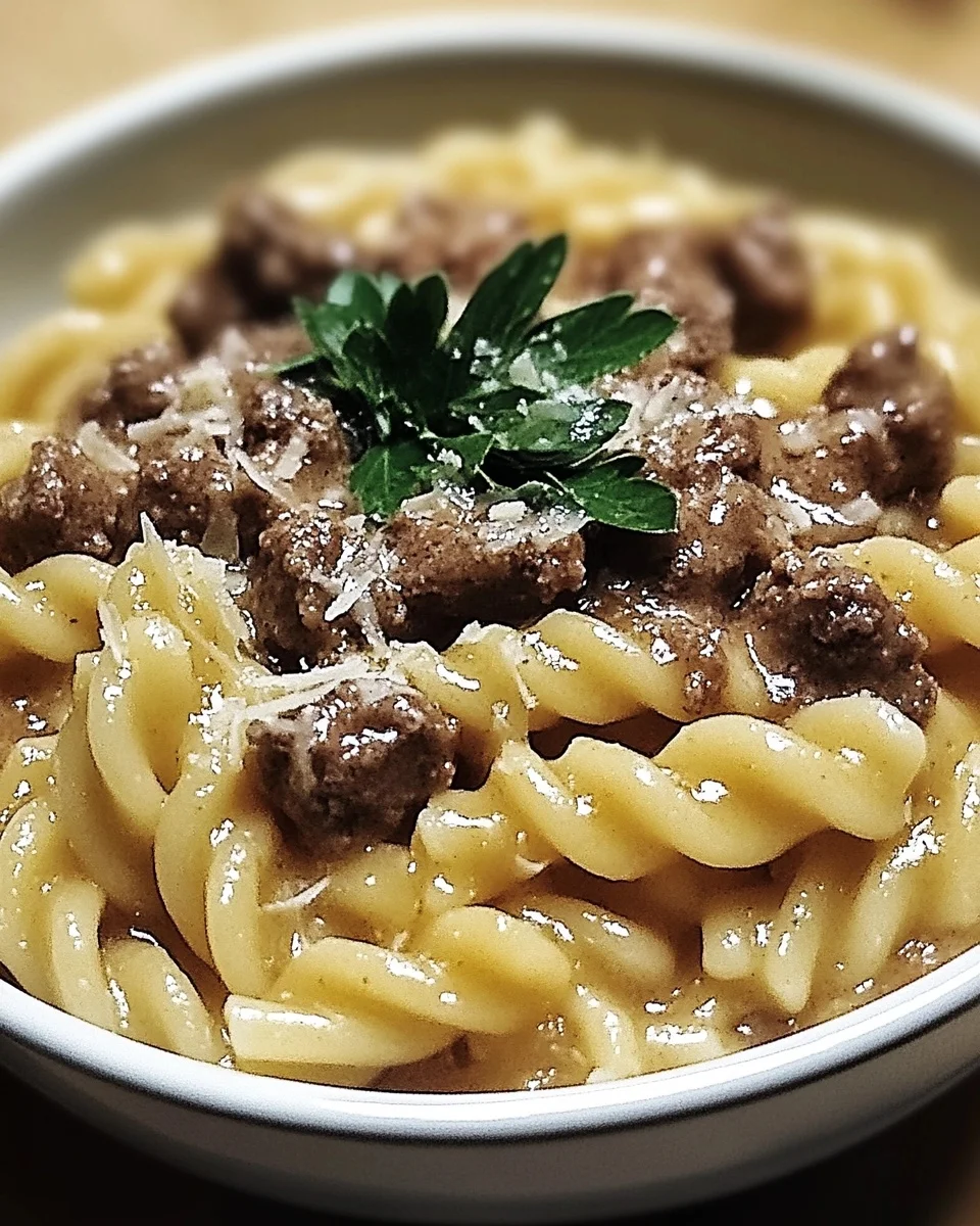 - Return the cooked beef to the skillet and stir it into the sauce. Add the drained rotini and mix until evenly coated.