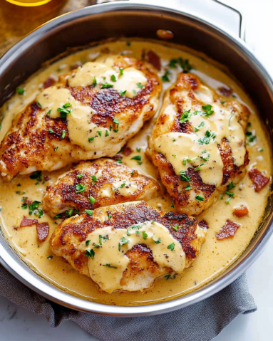 Combine:Return chicken breasts to the skillet, spoon sauce over them, and sprinkle crispy bacon on top. Let simmer for 2-3 minutes until heated through.