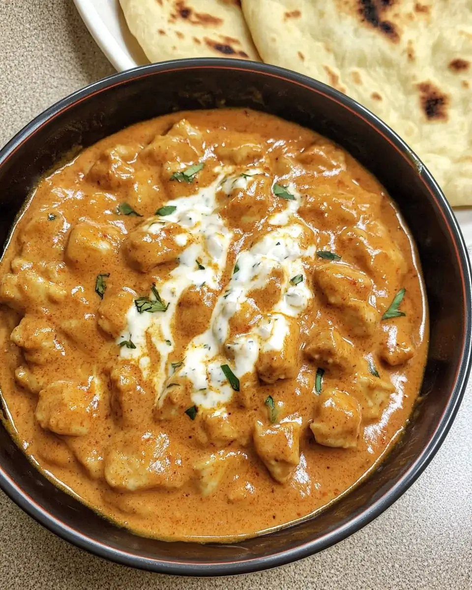 Serve the butter chicken hot, garnished with fresh cilantro, alongside the garlic naan.