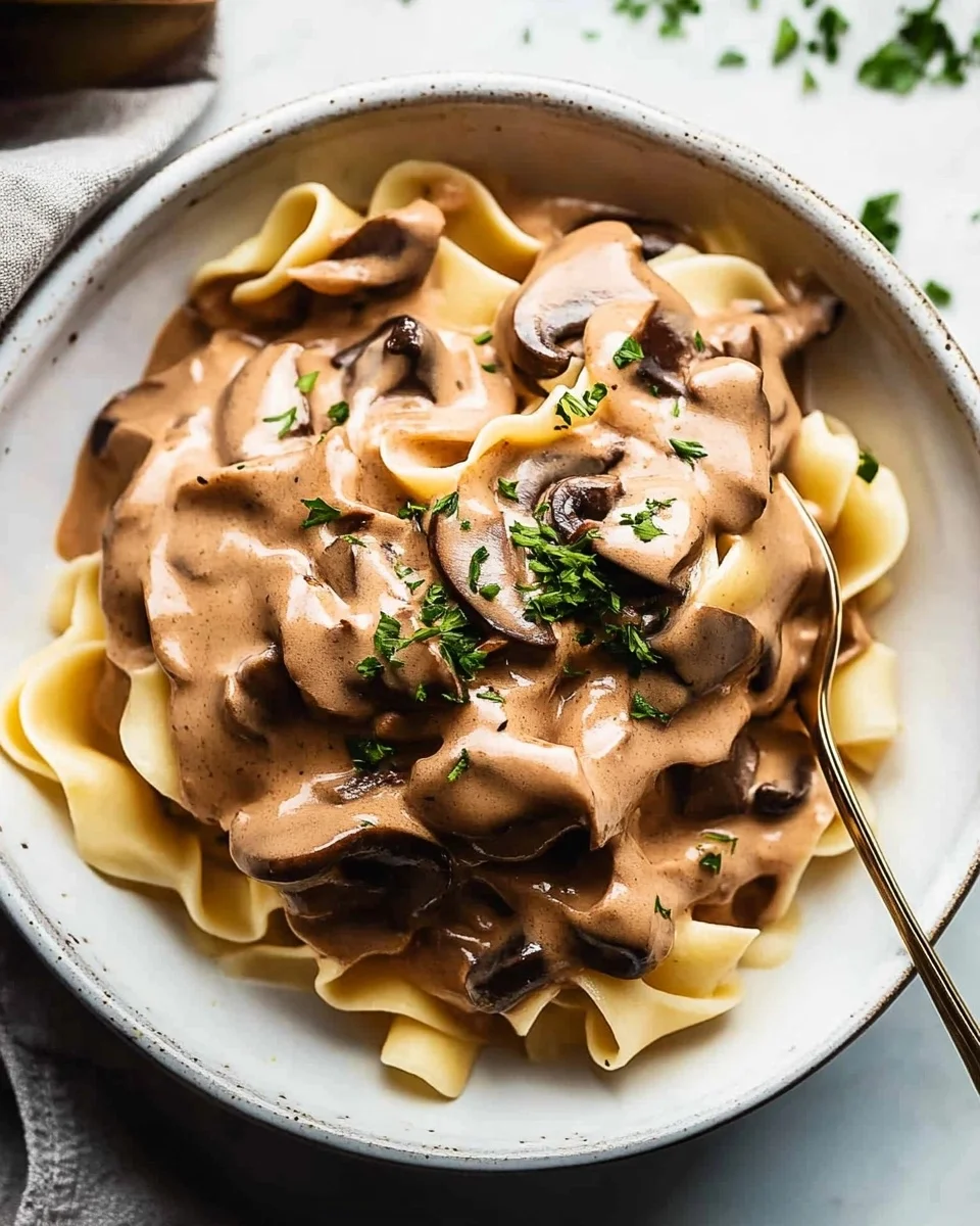 Serve and Garnish: Spoon the stroganoff over cooked egg noodles or rice, then garnish with fresh parsley. Enjoy warm!