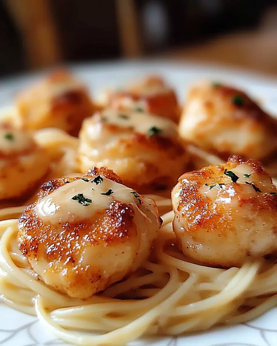 Serve the pasta on plates, topped with the garlic butter chicken bites. Garnish with fresh parsley and extra Parmesan if desired.