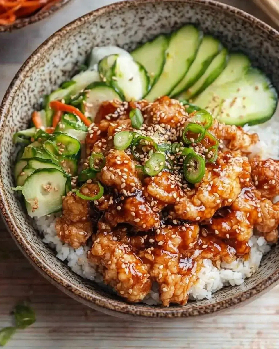 To serve, place a scoop of cooked rice in a bowl, top with the glazed chicken, and garnish with sliced green onions and sesame seeds.