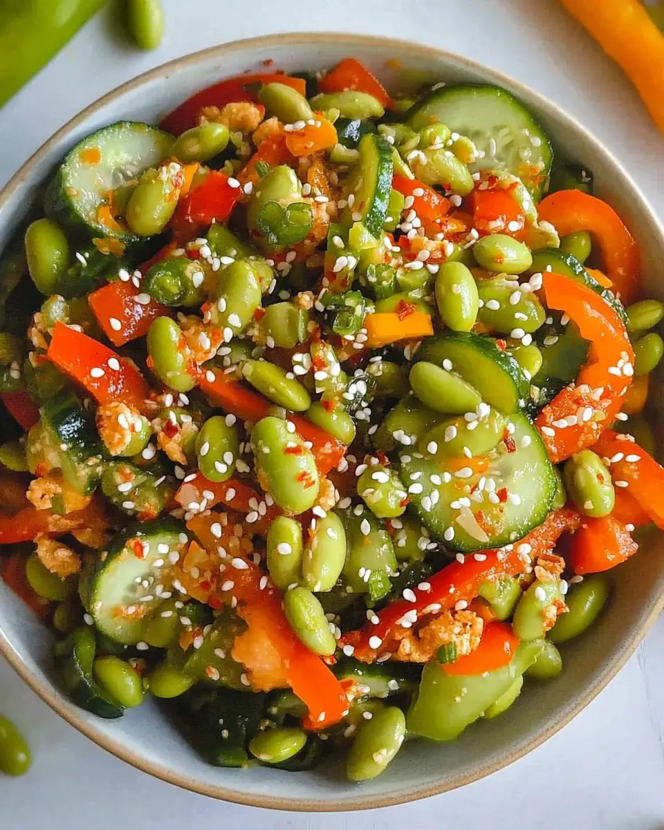 - In a large bowl, combine the diced cucumber, bell pepper, edamame, red onion, and cilantro.