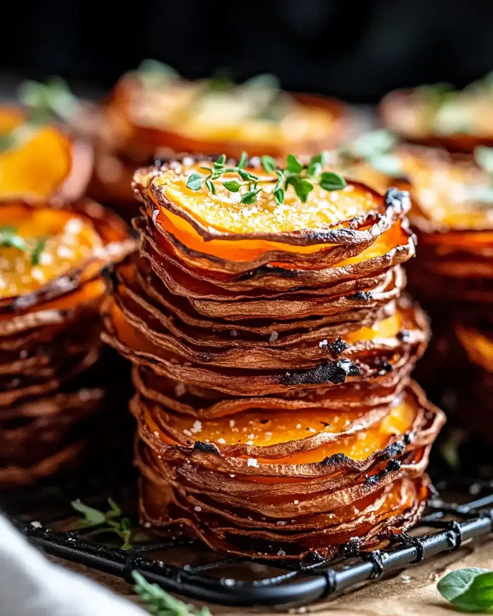 Stack the sweet potato slices in groups of 4-5 and place them upright on the prepared baking sheet. Repeat until all slices are stacked.
