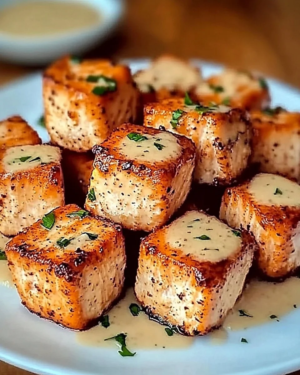 - Serve the salmon bites warm with your favorite dipping sauce, garnished with parsley and lemon wedges.