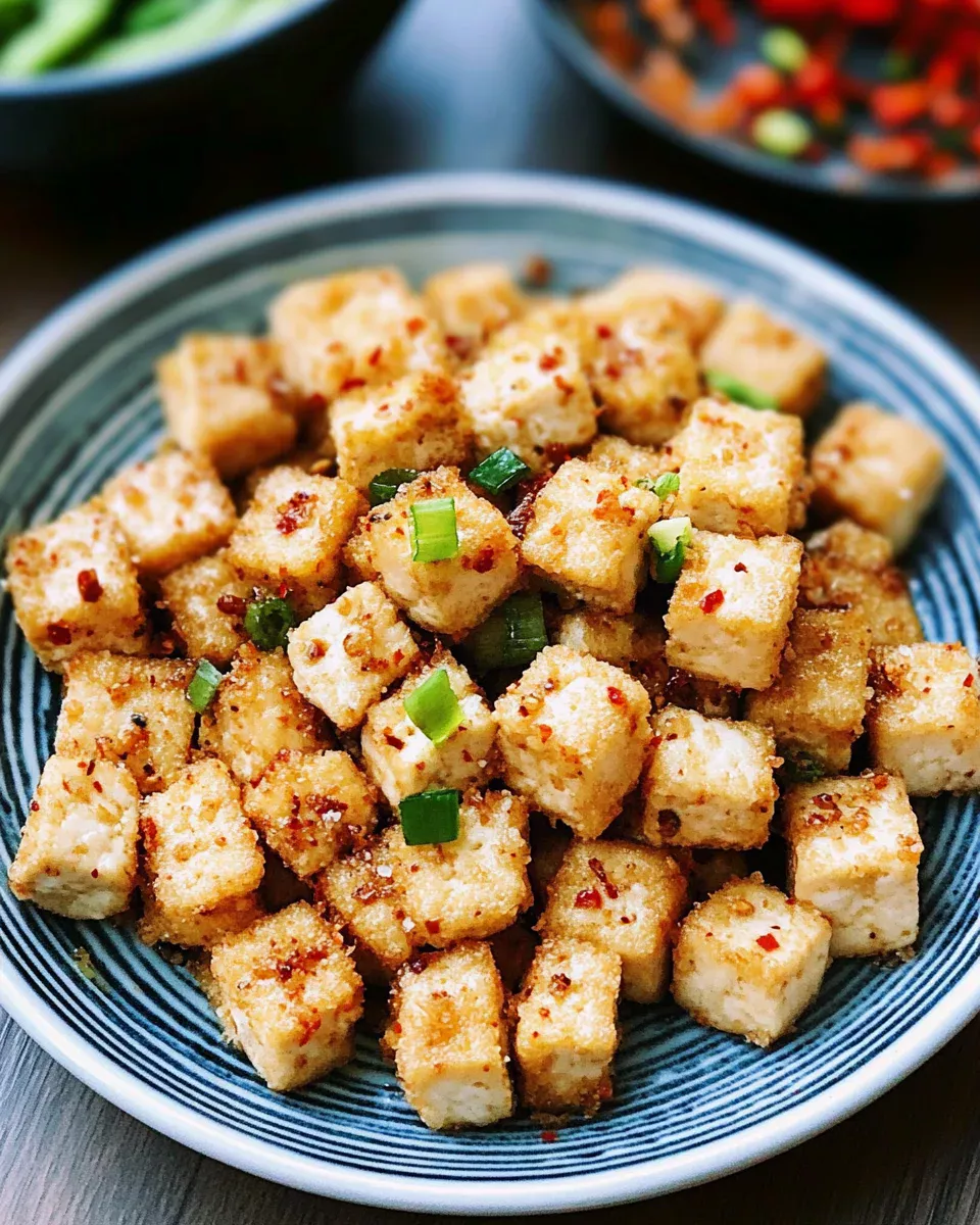 Once all the tofu is fried, sprinkle with additional salt and pepper to taste. Garnish with chopped green onions and serve with lemon wedges on the side.