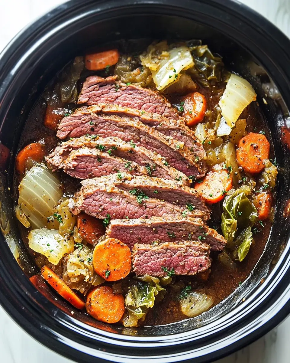 Cover and cook on low for 8 to 10 hours or on high for 4 to 5 hours, until the corned beef is tender.