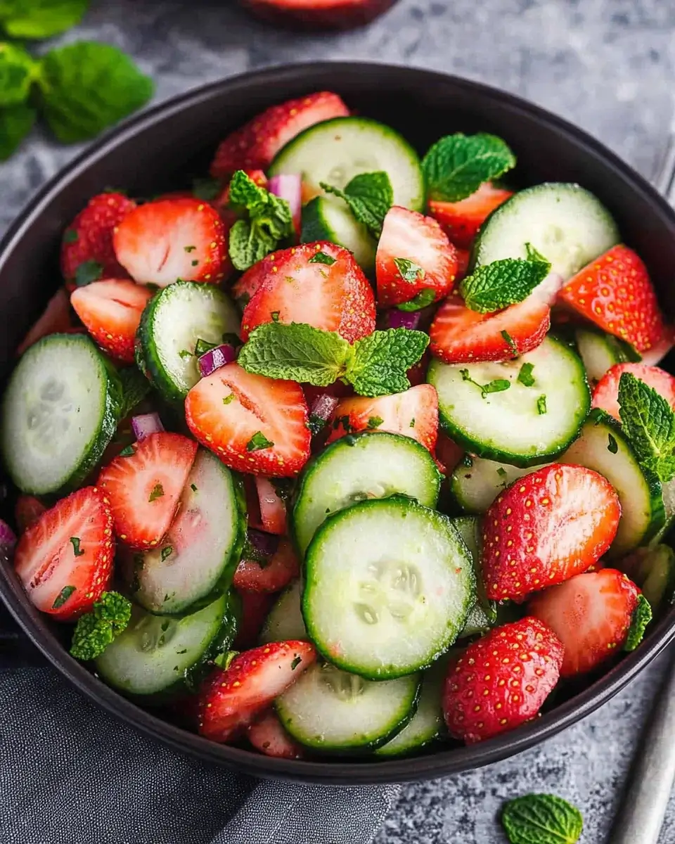 - In a large bowl, combine the sliced strawberries, diced cucumber, and red onion.