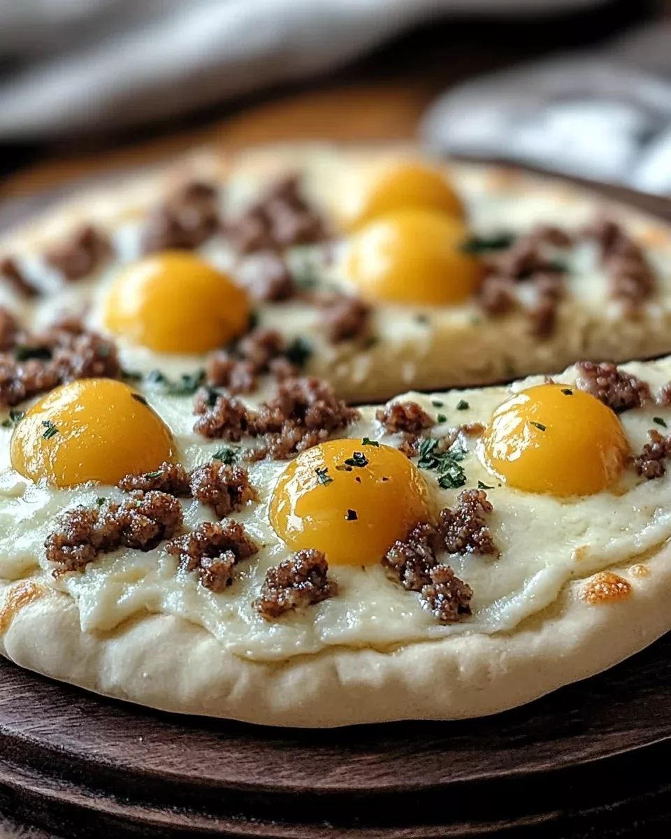 Assemble the Pizza – Spread the sausage gravy over the pre-baked biscuit crust, layer on the scrambled eggs, and sprinkle with shredded cheddar cheese.