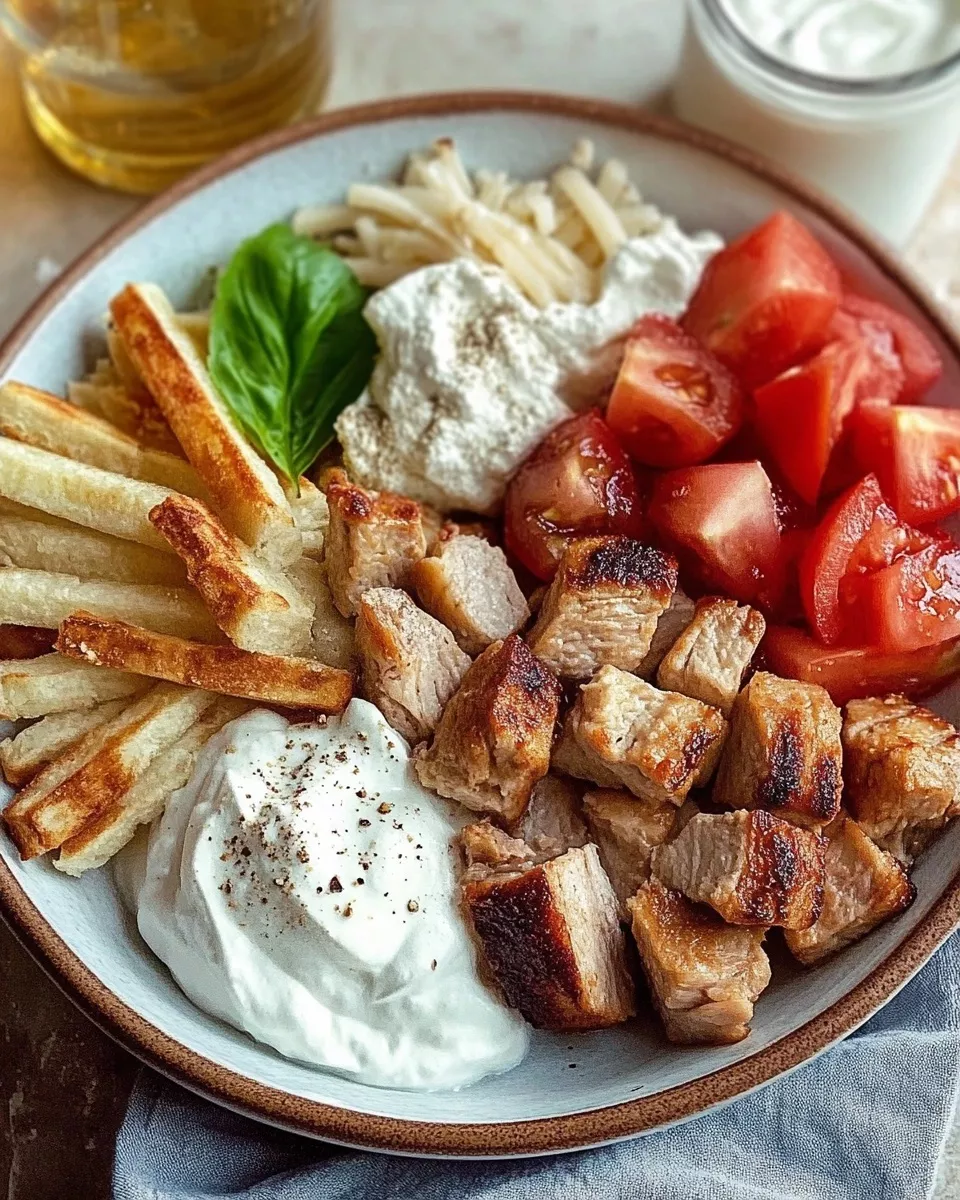 Drizzle with tzatziki sauce, garnish with fresh parsley or dill, and serve with warm pita wedges if desired.