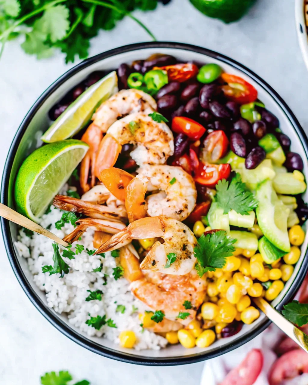 - Top with black beans, corn, cherry tomatoes, red onion, and avocado.