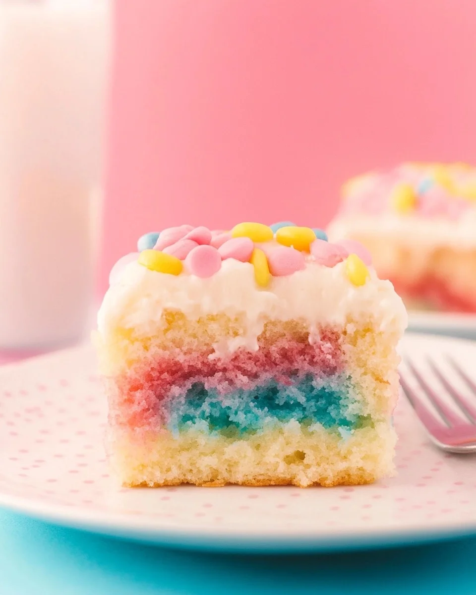 Frost and Decorate: Spread the frosting evenly over the cooled cake and top with pastel-colored sprinkles. Slice and enjoy!