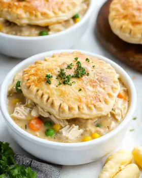 Serve the chicken pot pie mixture topped with a warm biscuit.