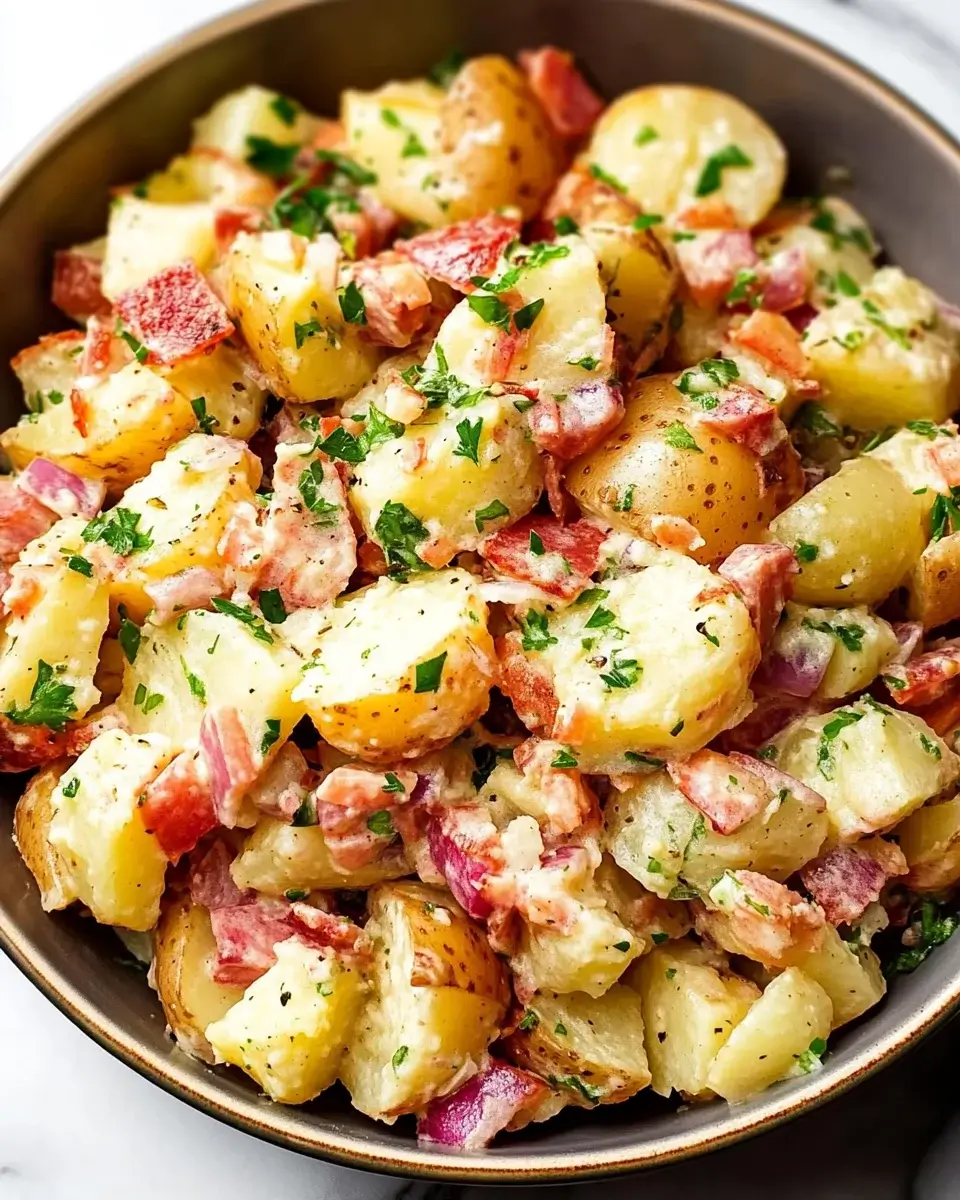 - Stir in potatoes and bacon, tossing to coat in warm dressing