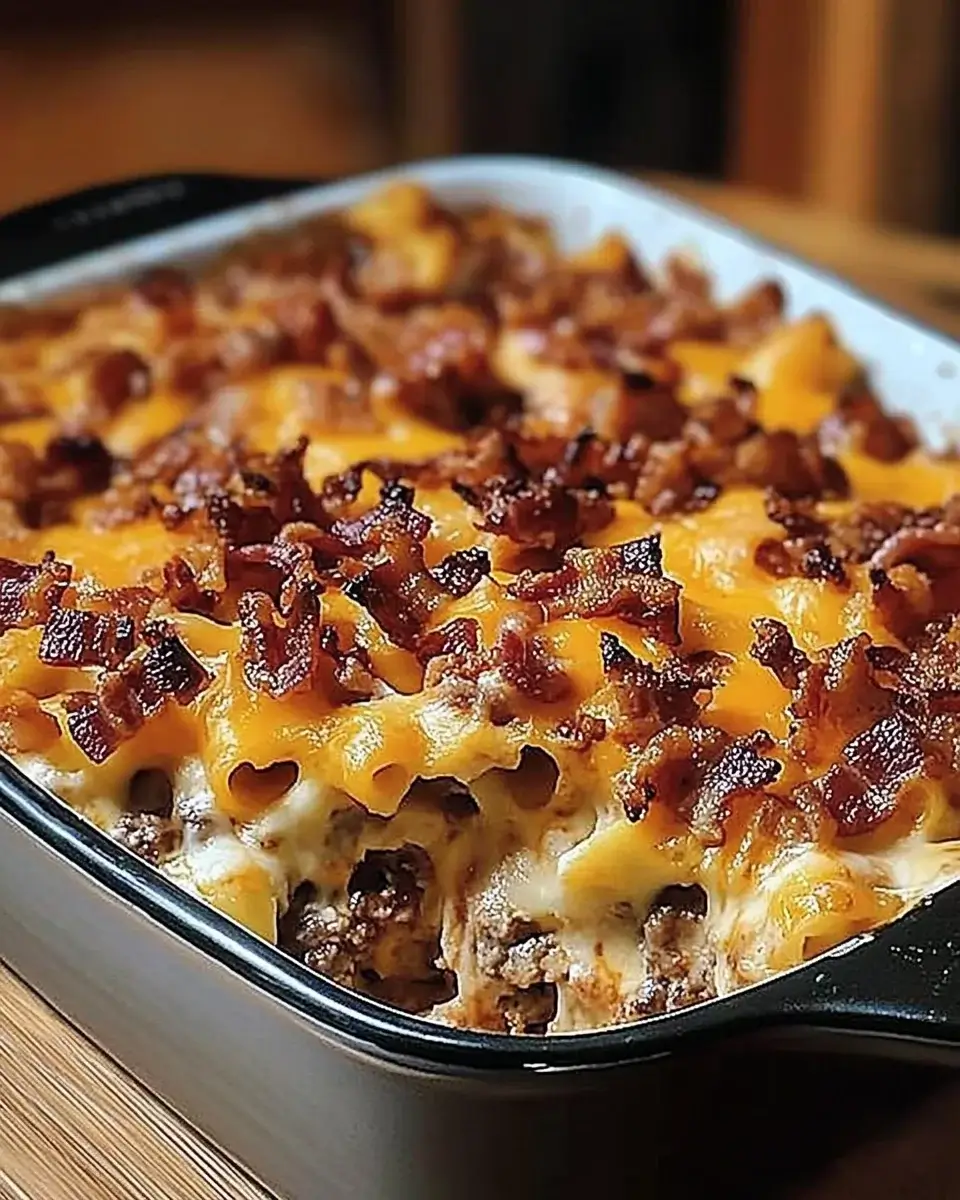 - Stir in BBQ sauce, milk, garlic powder, bacon, and half the cheese.