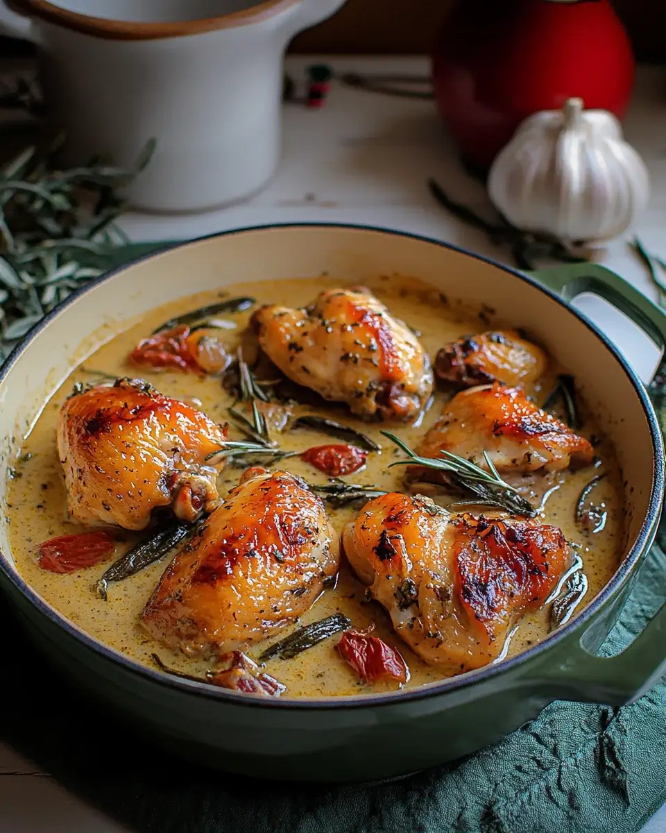 In a large oven-safe skillet, heat the olive oil over medium-high heat. Season the chicken thighs with salt, black pepper, garlic powder, thyme, and rosemary.