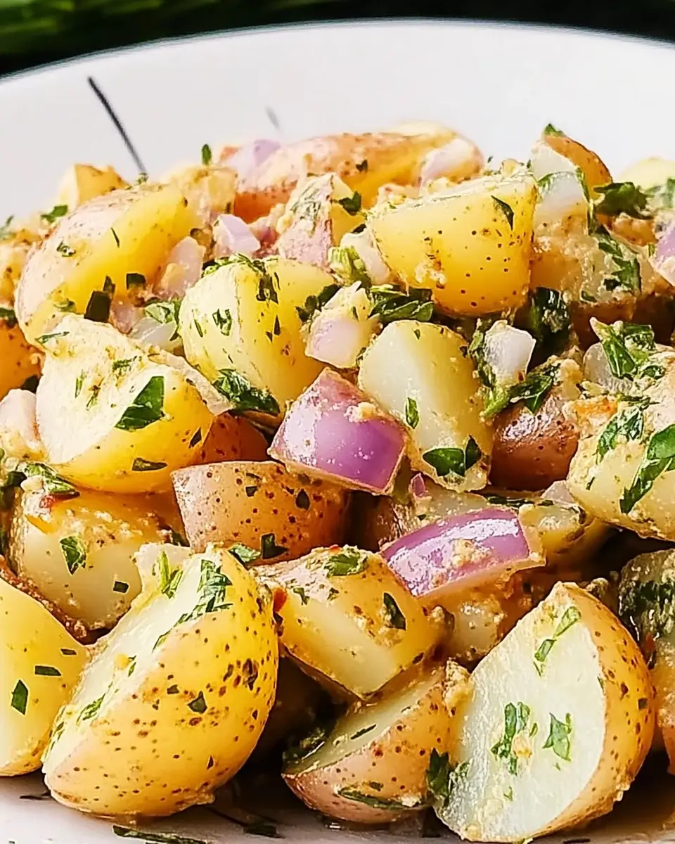 In a large mixing bowl, combine the warm potatoes, chopped parsley, chives, red onion, and celery. Pour the dressing over the potato mixture and gently toss to coat all the ingredients evenly.