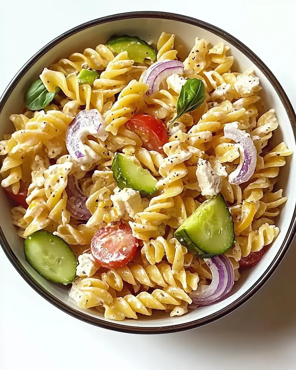 - In a large bowl, combine pasta, chicken, veggies, and feta.