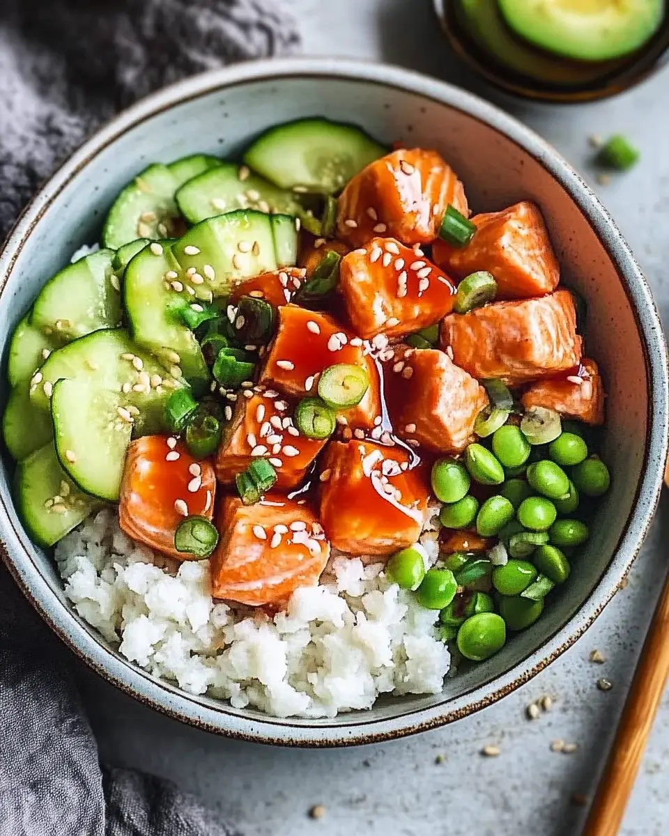 Once the salmon is done, place a fillet on top of each bowl and drizzle any remaining sauce from the baking sheet over the salmon.