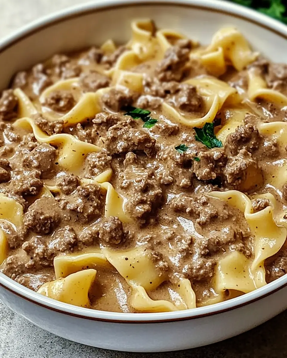 Serve the beef stroganoff over the egg noodles and garnish with chopped parsley.