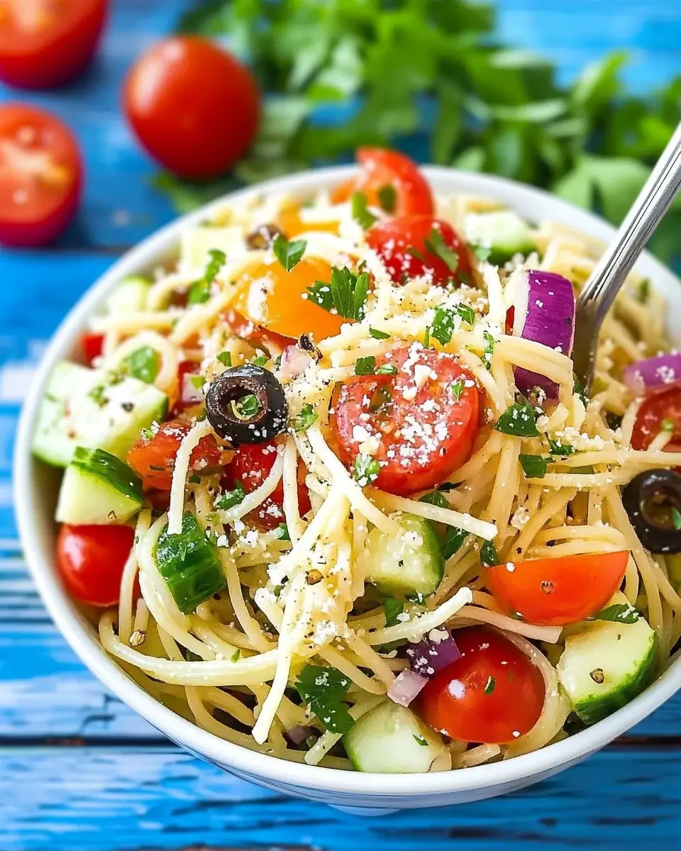 In a large mixing bowl, combine the cooled spaghetti, cherry tomatoes, cucumber, bell pepper, red onion, black olives, mozzarella balls, and Parmesan cheese.
