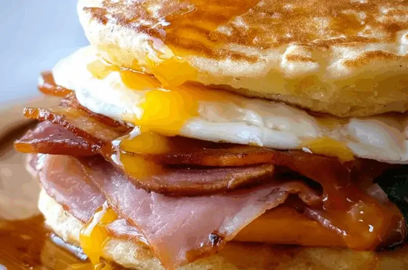 While the eggs are cooking, layer one pancake on a plate. Top it with two slices of bacon or a sausage patty, followed by half of the shredded cheddar cheese.