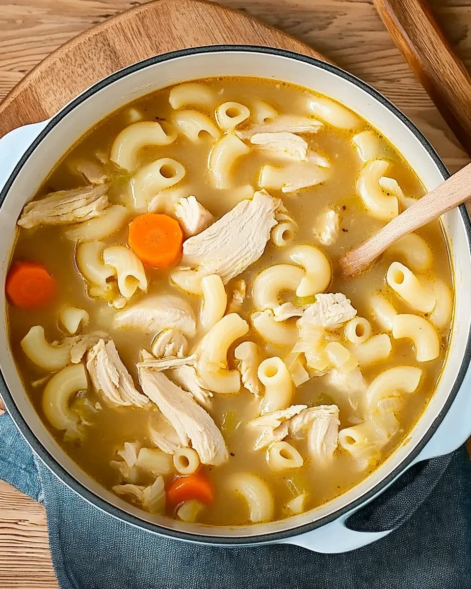 - Add the dry pasta and cooked chicken to the pot, stirring to combine.