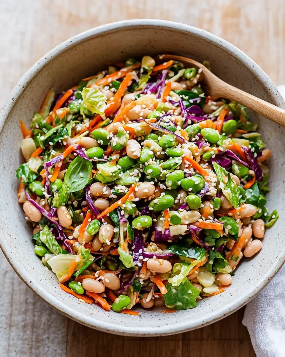 In a large mixing bowl, combine the chickpeas, black beans, edamame, cherry tomatoes, red bell pepper, green onions, and cilantro.