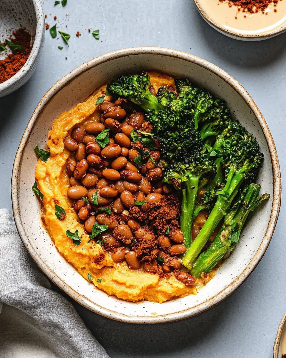 To assemble the bowls, scoop a generous portion of the whipped sweet potato into each bowl. Top with spiced beans, blanched broccolini, and sprinkle with sesame seeds and fresh cilantro if desired.