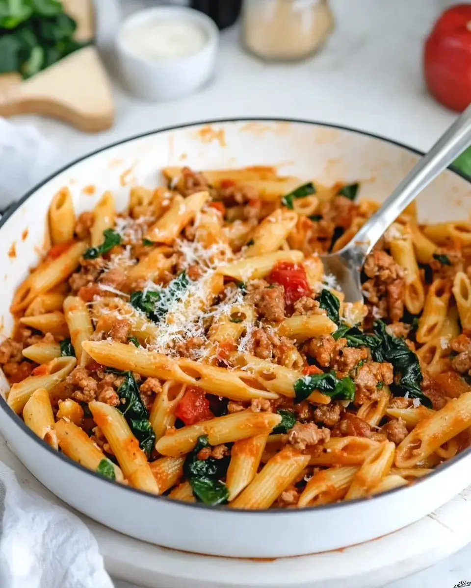 - Add spinach and stir until wilted. Toss in cooked pasta and reserved water if needed.