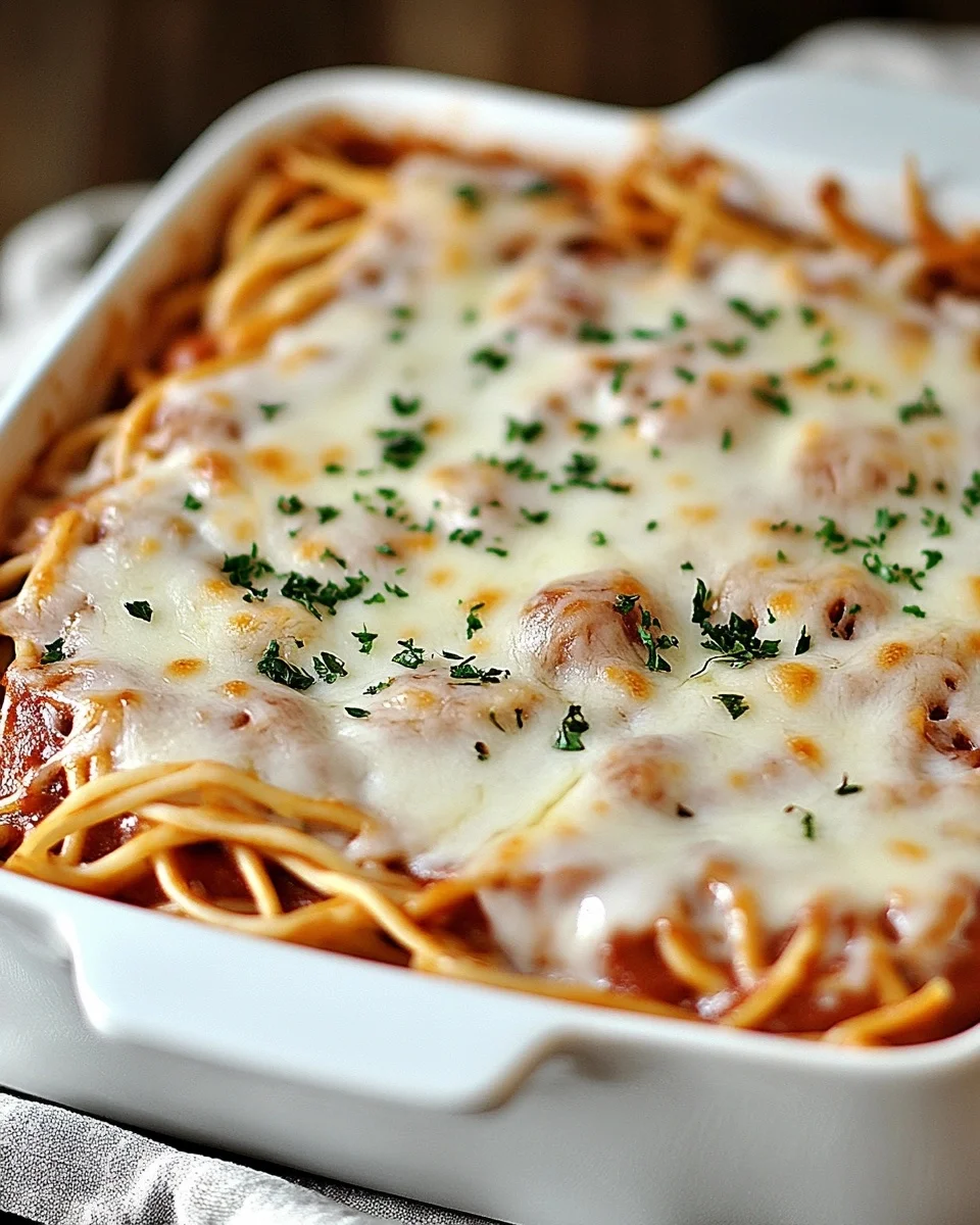 - Layer spaghetti, meat sauce, and cheeses in a baking dish.