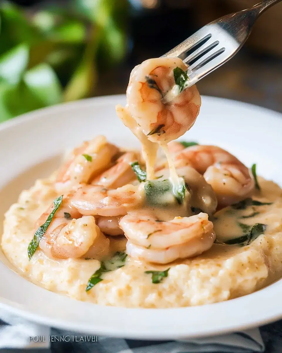 To serve, spoon the cheesy grits onto plates and top with the shrimp and bacon mixture. Garnish with sliced green onions and serve with lemon wedges on the side.