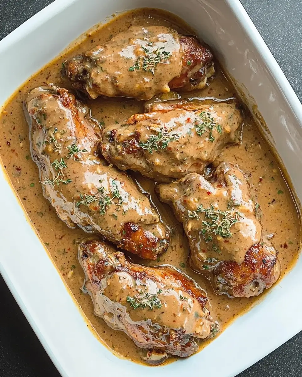 Place wings in a baking dish, top with sautéed onions and pour the soup mixture over.