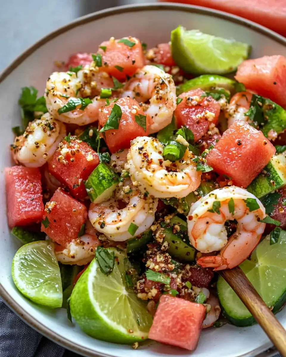 Add the cooked shrimp to the watermelon mixture. Squeeze lime juice over the salad and gently toss to combine.