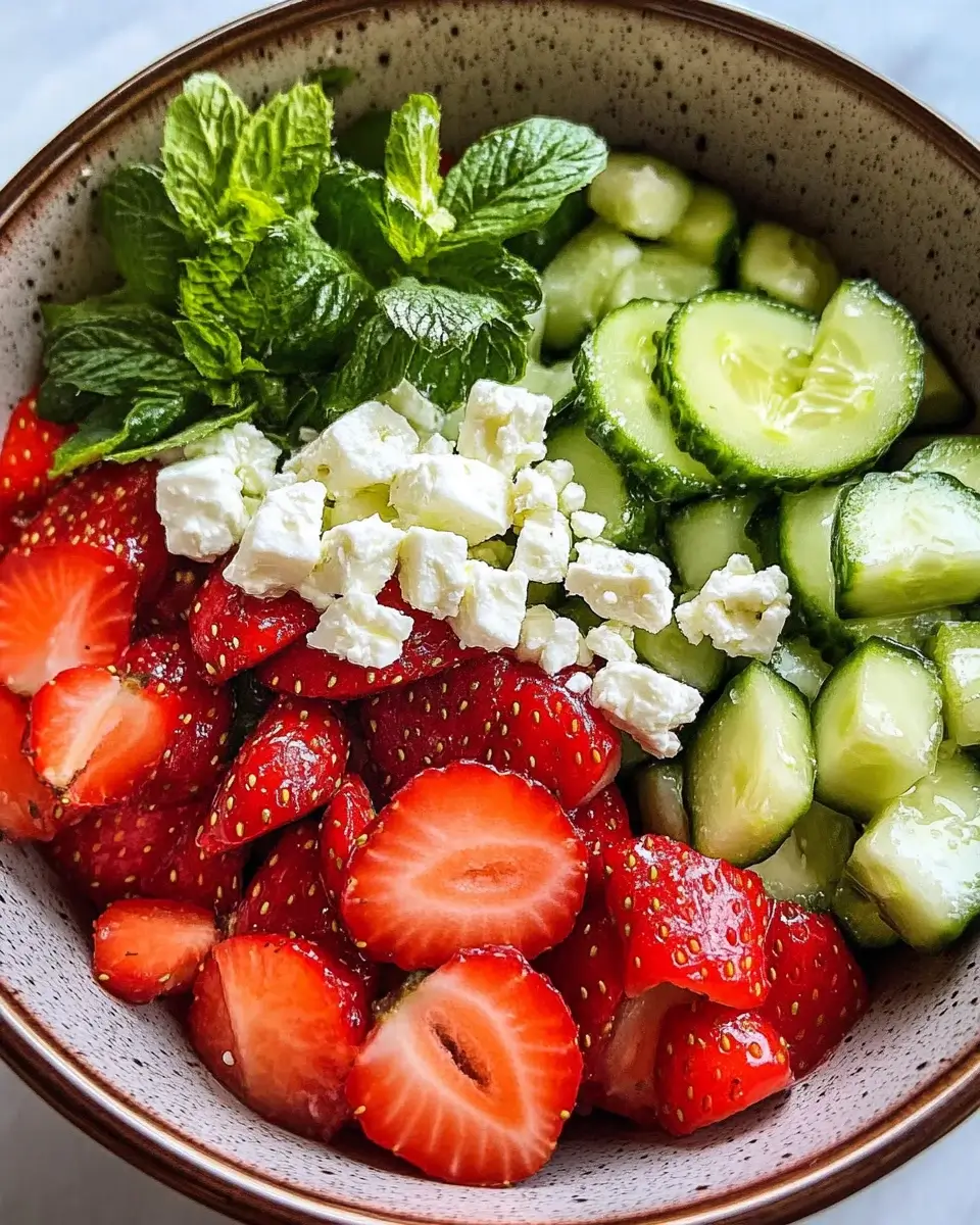 - In a large bowl, combine the sliced strawberries, diced cucumber, crumbled feta cheese, and thinly sliced red onion.