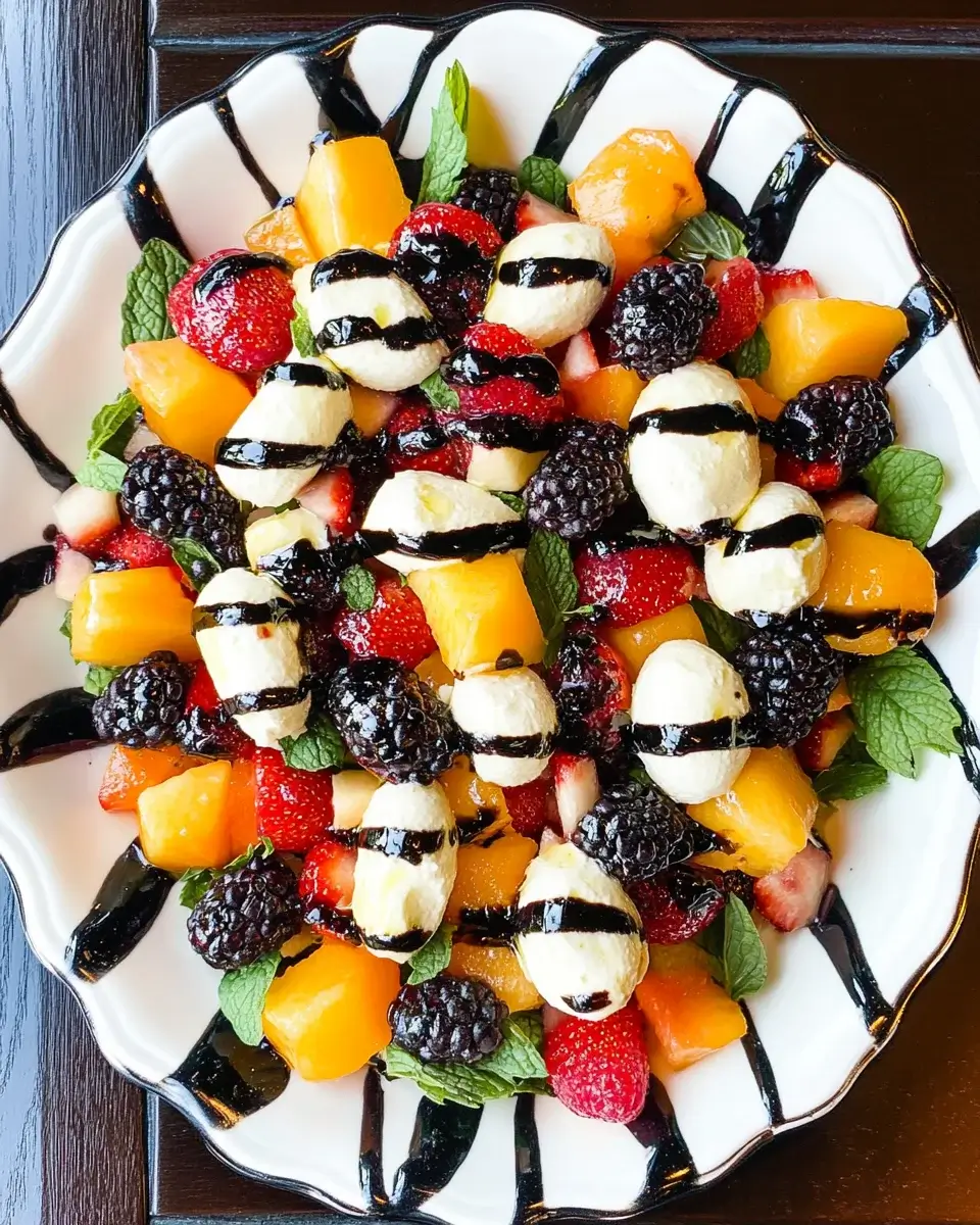 - In a large bowl, combine the fresh mozzarella balls and chopped summer fruits.