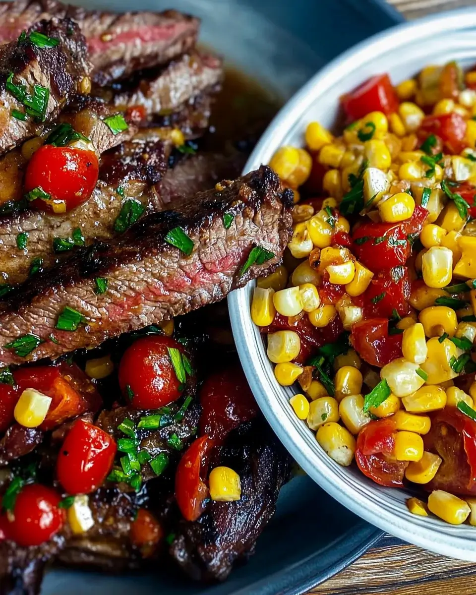 Slice the rested steak against the grain into thin strips and serve topped with the corn and tomato salad.