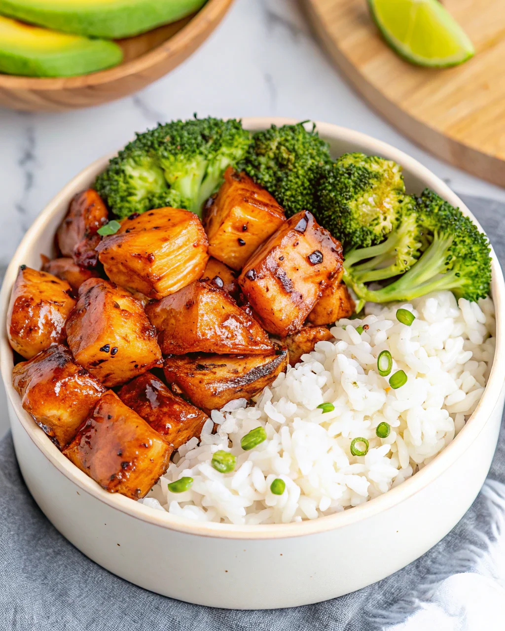 - Arrange the cooked salmon, cucumber, carrots, edamame, and avocado on top.